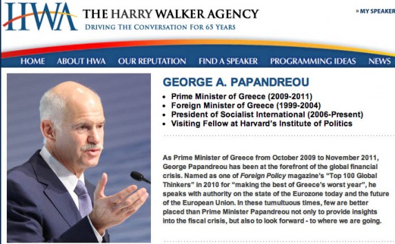 Ο Γ. Παπανδρέου, έγινε μέλος του γραφείου «The Harry Walker Agency» και είναι διαθέσιμος αρκεί να έχετε το απαιτούμενο ποσό να έρθει στην εκδήλωσή σας και να εκφωνήσει ομιλία για το θέμα που εσείς επιθυμείτε!Στην φόρμα επικοινωνίας καλείται ο ενδιαφερόμενος να πει πόσα χρήματα διαθέτει και από εκεί και πέρα το γραφείο θα εκτιμήσει αν είναι αρκετά συνυπολογίζοντας το κασέ του κ. Παπανδρέου.