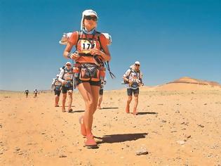 Στην άλλη άκρη της Γης, σε μια έρημο του Νοτίου Μαρόκου, σε θερμοκρασίες λίγο πιο πάνω από τους 50 βαθμούς Κελσίου, άλλοι, με αθλητική περιβολή και μόνο με ένα σακίδιο στην πλάτη, με τα απολύτως απαραίτητα και σ' αυτά να βρίσκεται και ένα κουτί πρώτων βοηθειών που περιελάμβανε