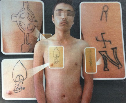 Το τατουάζ με τον αγκυλωτό σταυρό, το έχει στο αριστερό του μπράτσο, μαζί με δύο γράμματα (N και R). Στην πλάτη του έχει ένα σχέδιο που μοιάζει με τον κέλτικο σταυρό, ενώ στον θώρακα έχει τατουάζ που μοιάζει με αναμμένο κερί. Αυτά τα σύμβολα τράβηξαν αμέσως την προσοχή των αστυνομικών, αλλά ο δράστης αρνήθηκε να απαντήσει στις επίμονες ερωτήσεις τους, για το που τα έκανε και τι ακριβώς θέλει να συμβολίσει με αυτά.