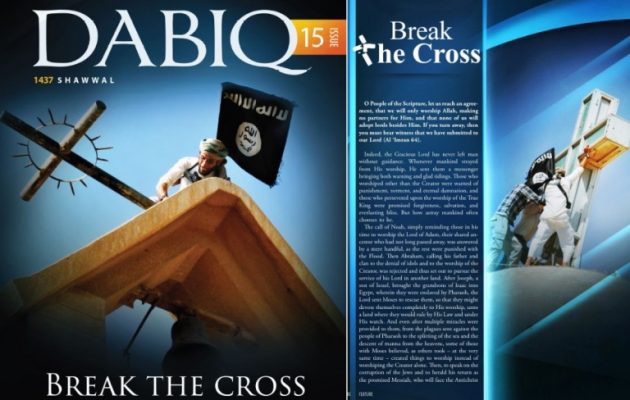 Το Νταμπίκ έχει εξώφυλλο με τίτλο «Σπάσε τον Σταυρό» και φωτογραφία ένα τζιχαντιστή να γκρεμίζει τον σταυρό από μια ασσυριακή (προφανώς) εκκλησία και να υψώνει στη θέση του τη σημαία της οργάνωσης Ισλαμικό Κράτος (ISIS).