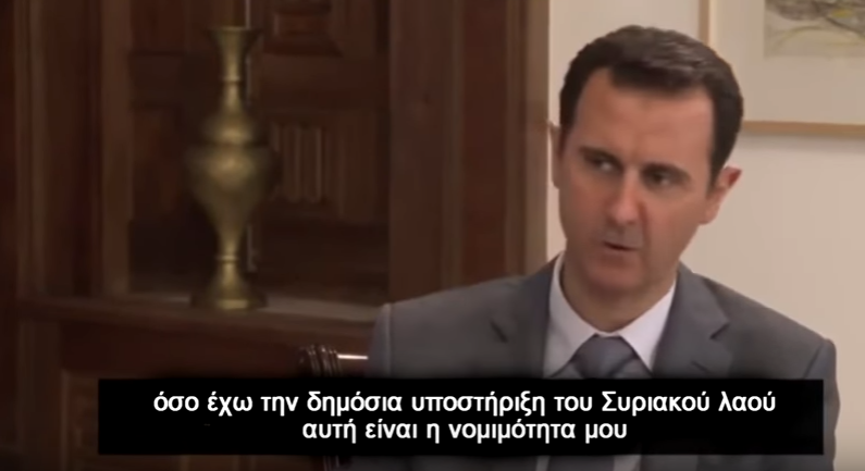 Μπασάρ αλ Άσαντ (Πρόεδρος της Συρίας): Η παρέμβαση στην Συρία είναι το θέμα. Δεν με νοιάζει για να είμαι ειλικρινής, ποτέ δεν με ένοιαζε όσο έχω την δημόσια υποστήριξη του Συριακού λαού, αυτή είναι η νομιμότητά μου. Από κει πηγάζει, αλλά θα σου πω γιατί τα λένε αυτά. Η Αμερική (ΗΠΑ) θέλει μαριονέτες, όχι ανεξάρτητους ηγέτες, σε καμία χώρα και αυτό είναι και το πρόβλημα τους με τον Πούτιν. Γι’ αυτό δαιμονοποιούν τον Πούτιν, επειδή λέει ¨ΟΧΙ¨ και θέλει να είναι ανεξάρτητος. Γιατί η Δύση και περισσότερο η Αμερική (ΗΠΑ) δεν αποδέχονται εταίρους. Αποδέχονται μόνο ακόλουθους! Και η Ευρώπη ακόμα δεν είναι εταίροι με την Αμερική (ΗΠΑ). Για να είμαι απόλυτα ειλικρινής μαζί σου. οπότε αυτό είναι το πρόβλημά τους με την Συρία. Θέλουν κάποιον να τους λέει ναι σε όλα. Μια μαριονέτα. Κάποιον που θα μπορούν να ελέγχουν.