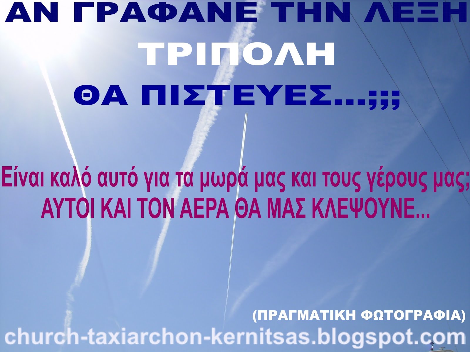 Δεν θα πάψω να γράφω για τους αεροψεκασμούς (Chemtrails) που γίνονται εδώ και χρόνια και στην Τρίπολη, όπως και στο εξωτερικό, γιατί πολλοί συμπατριώτες νομίζουν πως μιλώ για αθώους ψεκασμούς για κουνούπια και χωράφια, ενώ μιλούνε στο εξωτερικό για οργανωμένο σχέδιο ΓΕΝΝΟΚΤΟΝΙΑΣ από αεροπλάνα τύπου τάνκερ του ΝΑΤΟ!!!