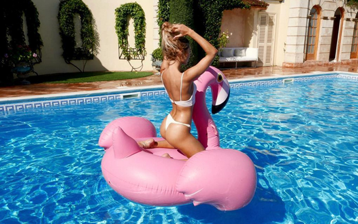 Η καλλίγραμμη καλλονή εντυπωσιάζει με τις καμπύλες της ενώ τα μαγιό που η ίδια σχεδιάζει αναδεικνύουν τα πλούσια προσόντα της.