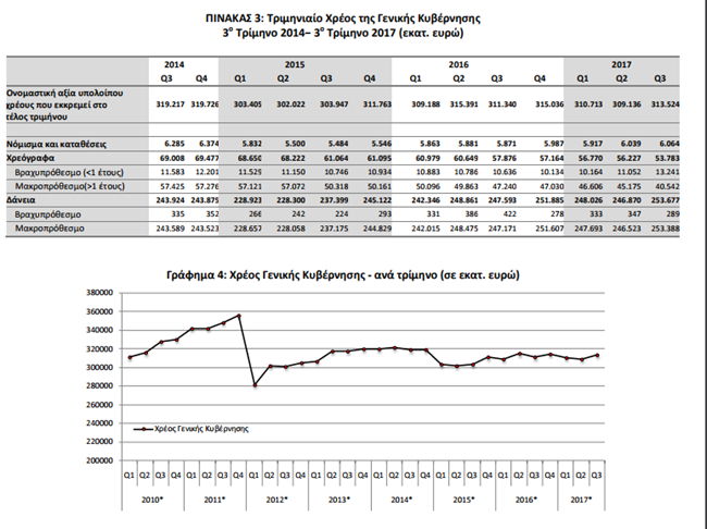 Το πρώτο τρίμηνο του 2017, το χρέος του ελληνικού δημοσίου διαμορφωνόταν στα 310,713 δισ. ευρώ.