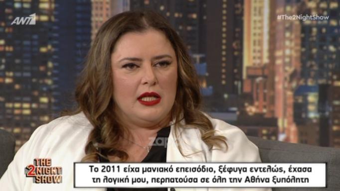«Το 2011 είχα μανιακό επεισόδιο. Ξέφυγα εντελώς! Έχασα τη λογική μου. Είχα μια υπερδιέγερση. Δεν μπορούσα να κοιμηθώ. Δεν μπορούσα να μείνω σταθερά σε ένα σημείο, ήθελα να περπατάω συνέχεια. Περπατούσα σε όλη την Αθήνα ξυπόλητη. Ήταν λες και όλα λειτουργούσαν στο maximum που θα μπορούσα να λειτουργήσουν. Γενικότερα ήμουν σε υπομανίες στο παρελθόν. Μετά που κατάλαβα τι γίνεται και αναλογίστηκα το παρελθόν μου, ήμουν άνθρωπος που ήμουν λίγο πριν τη μανία. Ας πούμε δεν κουραζόμουν. Μπορεί να ήμουν στο στούντιο μία εβδομάδα μόνο με καφέ και τυρόπιτα, χωρίς να κοιμάμαι. Αυτά είναι δείγματα υπομανίας. Δεν είναι φυσιολογικό ένας άνθρωπος να μην κοιμάται 4-5 μέρες.