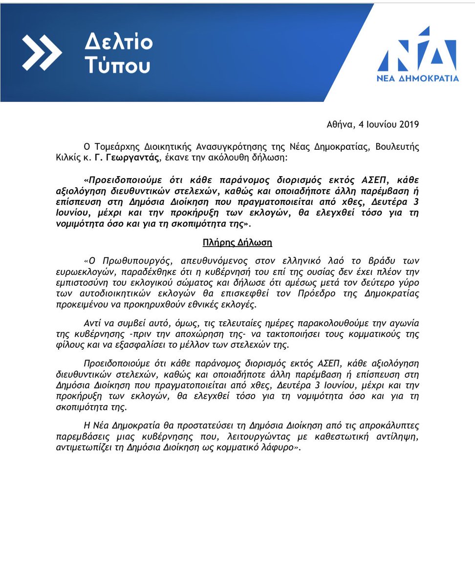 Κάθε παράνομος διορισμός εκτός ΑΣΕΠ, κάθε αξιολόγηση διευθυντικών στελεχών, και οποιαδήποτε άλλη παρέμβαση ή επίσπευση στη Δημόσια Διοίκηση που πραγματοποιείται από τις 3 Ιουνίου, μέχρι την προκήρυξη των εκλογών, θα ελεγχθεί τόσο για τη νομιμότητα όσο και για τη σκοπιμότητα της.