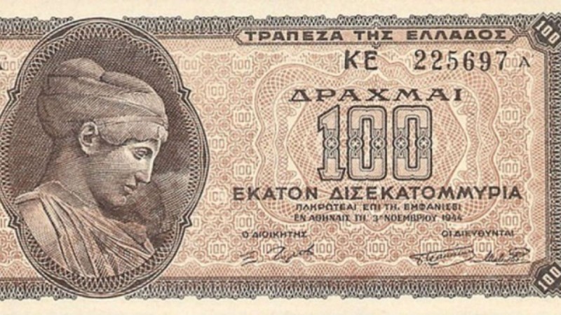 Στις 3 Νοεμβρίου του 1944 κυκλοφόρησε στην Ελλάδα το μεγαλύτερο σε ονομαστική αξία ελληνικό χαρτονόμισμα όλων των εποχών, των 100 δισεκατομμυρίων δραχμών.