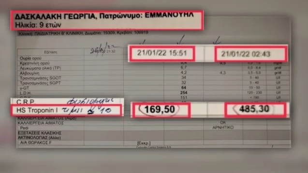Όπως φαίνεται στο έγγραφο που παρουσιάζει το MEGA, η 9χρονη παρουσίασε μια αλματώδη αύξηση της ουσίας τροπονίνης στο αίμα της.