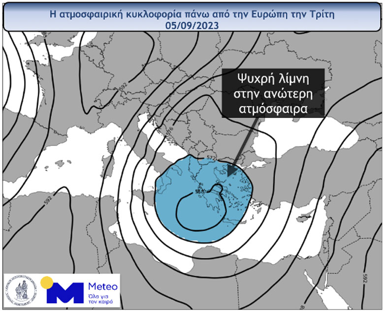 Εικόνα 1: Η ατμοσφαιρική κυκλοφορία πάνω από την Ευρώπη την Τρίτη 05/09/2023