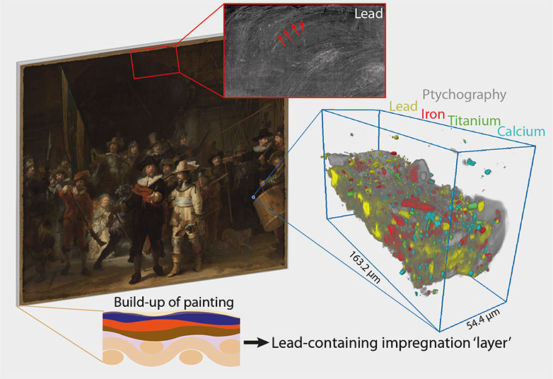 Με τη βοήθεια της τεχνικής αυτής, οι ερευνητές ανακάλυψαν ότι κάτω από το στρώμα εδάφους από χαλαζία και άργιλο στον καμβά, υπάρχει ένα στρώμα πλούσιο σε μόλυβδο. «Αυτό το εύρημα μας δείχνει ότι ο Ρέμπραντ δεν φοβόταν να δοκιμάσει νέες τεχνικές», παρατηρεί η κ. Μπρόερς. «Ο πίνακας ήταν τόσο μεγάλος σε διαστάσεις που ο ζωγράφος δεν μπορούσε να χρησιμοποιήσει τις συνήθεις μεθόδους, οπότε αναζητούσε εναλλακτικές και εκτιμούμε ότι χρησιμοποίησε μόλυβδο για να προστατεύσει τον πίνακα από την υγρασία», προσθέτει.