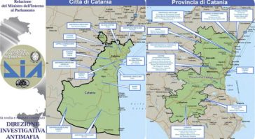 (Στην παραπάνω φωτογραφία η Διεύθυνση Ερευνών κατά της Μαφίας έχει χαρτογραφήσει τις οικογένειες της Κόζα Νόστρα και τις περιοχές δράσεις τους στην επαρχία της Κατάνια)
