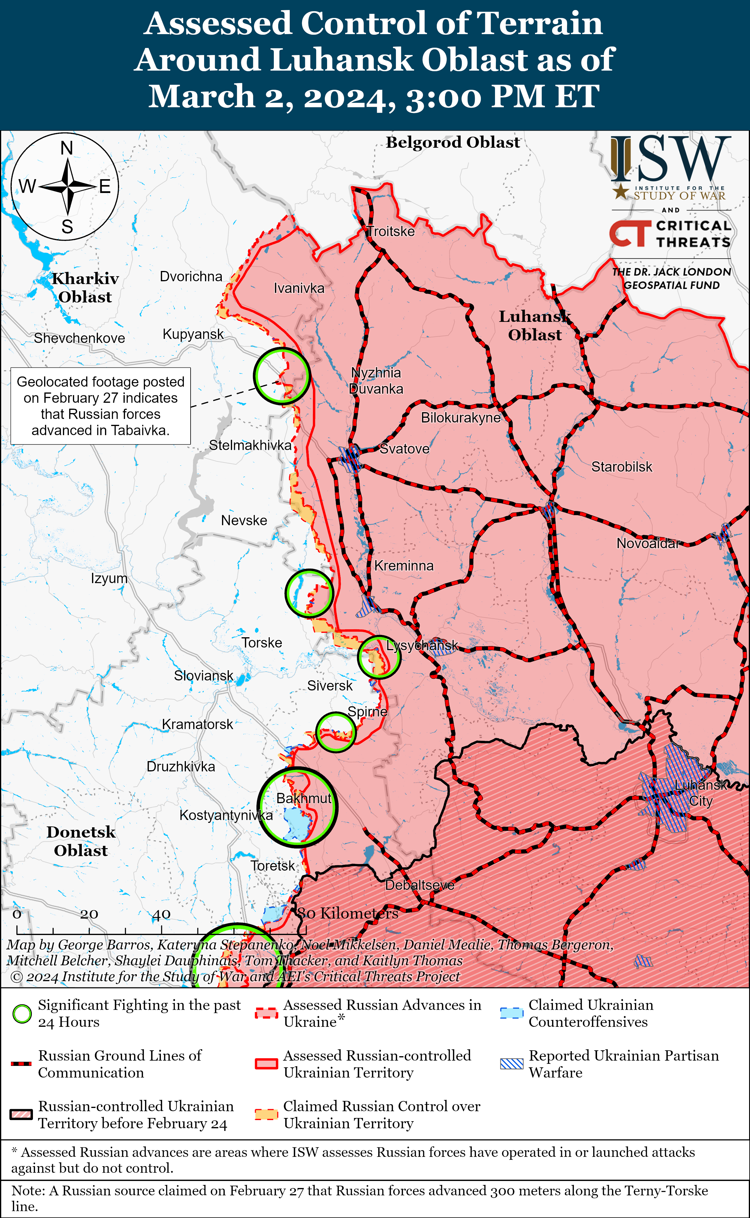 Το γεωγραφικό υλικό που δημοσιεύτηκε στις 2 Μαρτίου δείχνει ότι οι ρωσικές δυνάμεις προχώρησαν επίσης στο Tonenke (δυτικά της Avdiivka).