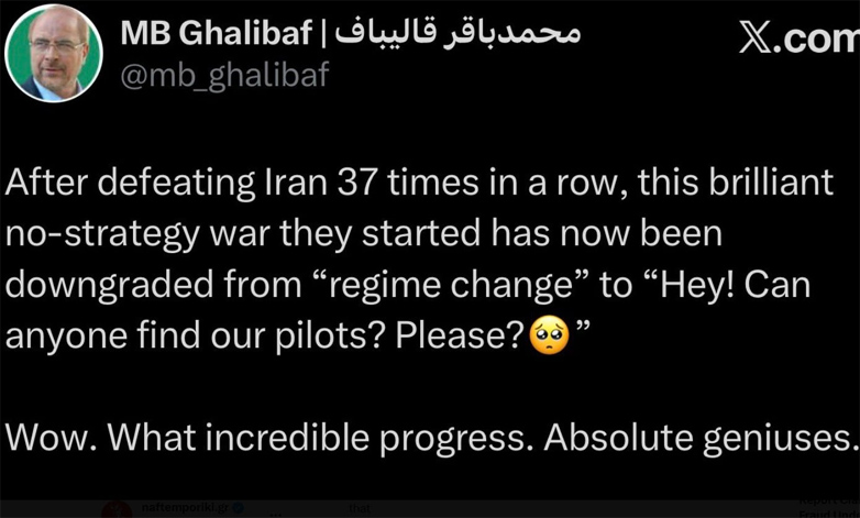 «Αφού νίκησαν το Ιράν 37 συνεχόμενες φορές, αυτός ο λαμπρός πόλεμος χωρίς στρατηγική που ξεκίνησαν έχει πλέον υποβαθμιστεί από «αλλαγή καθεστώτος» σε «Γεια σας! Μπορεί κανείς να βρει τους πιλότους μας; Παρακαλώ», αναφέρει στην ανάρτηση.